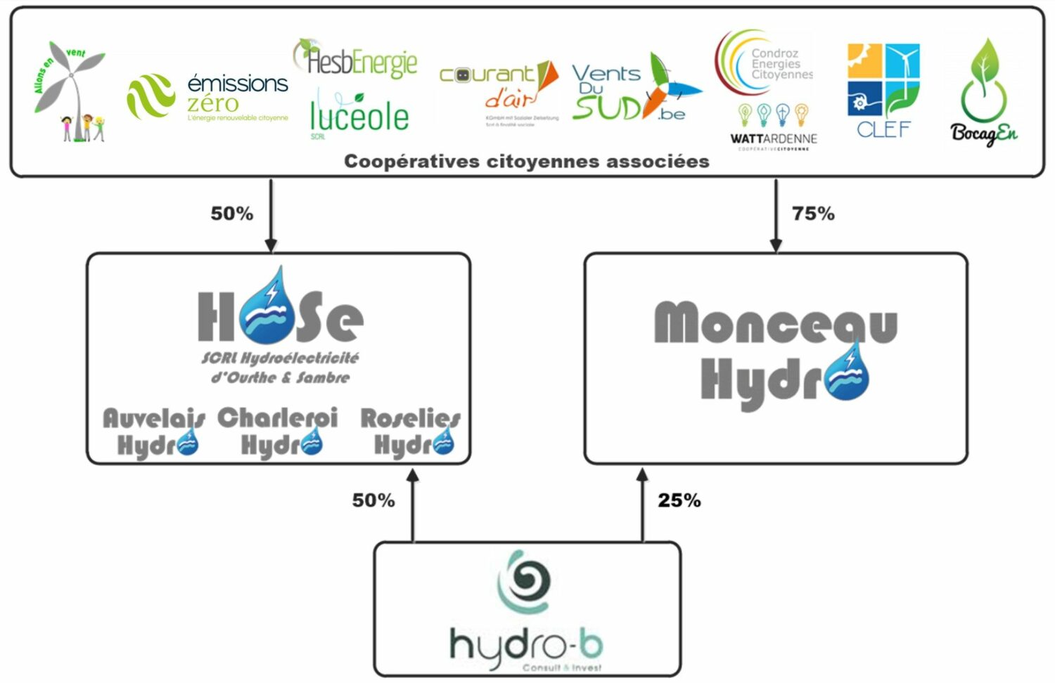 Partenariat : 25,00 % Emissions Zéro 1,83 % Allons en Vent 1,50 % Clef 1,50 % Condroz Energies Citoyennes 10,00 % Courant d’Air 4,83 % HesbEnergie 50,00 % HydroB 1,50 % Lucéole 2,33 % Vents du Sud 1,50 % WattArdenne